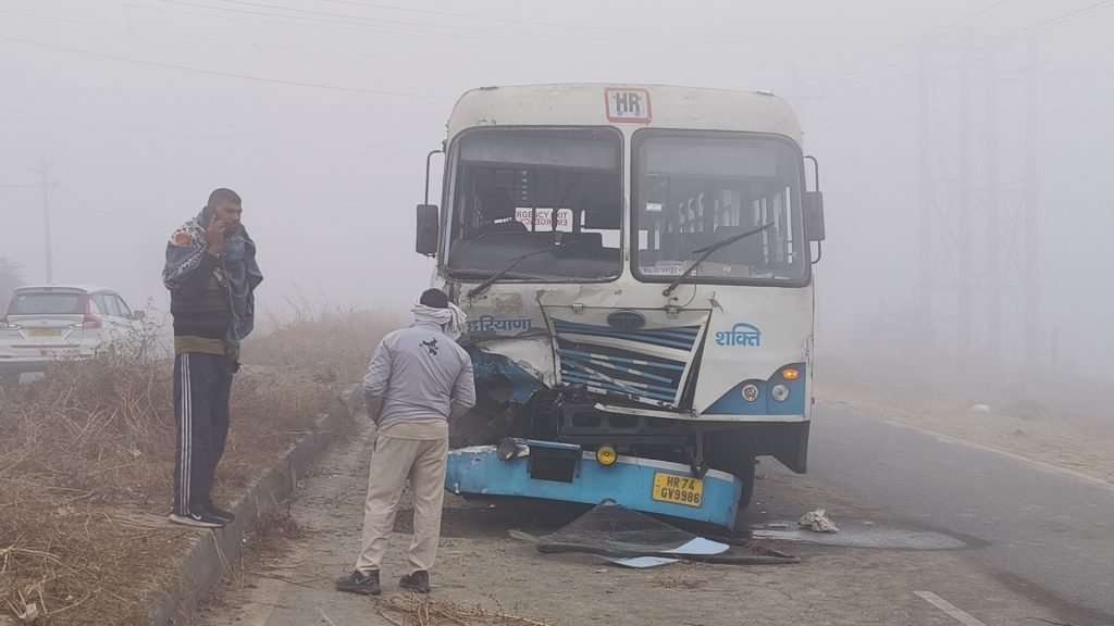 घने कोहरे के कारण बड़ा हादसा टला, हरियाणा रोडवेज बस ट्रैक्टर-ट्रॉली से टकराई।