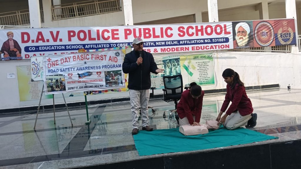 नूंह | उपायुक्त एवं जिला रैड क्रॉस सोसाइटी नूंह के अध्यक्ष अखिल पिलानी तथा जिला पुलिस अधीक्षक राजेश कुमार के कुशल मार्गदर्शन में, एवं सचिव महेश गुप्ता की देखरेख में जिला रैड क्रॉस सोसाइटी नूंह द्वारा “सड़क सुरक्षा नियमों की पालना एवं प्राथमिक सहायता की जानकारी” विषय पर जागरूकता सेमिनार डीएवी पुलिस पब्लिक स्कूल, पुलिस लाइन नूंह में आयोजित किया गया। कार्यक्रम की अध्यक्षता विद्यालय प्रिंसिपल बलवंत बिश्नोई ने की। उन्होंने कहा कि आधुनिक समय में प्रत्येक नागरिक, विशेष रूप से युवाओं के लिए फर्स्ट एड की जानकारी अत्यंत लाभकारी है।