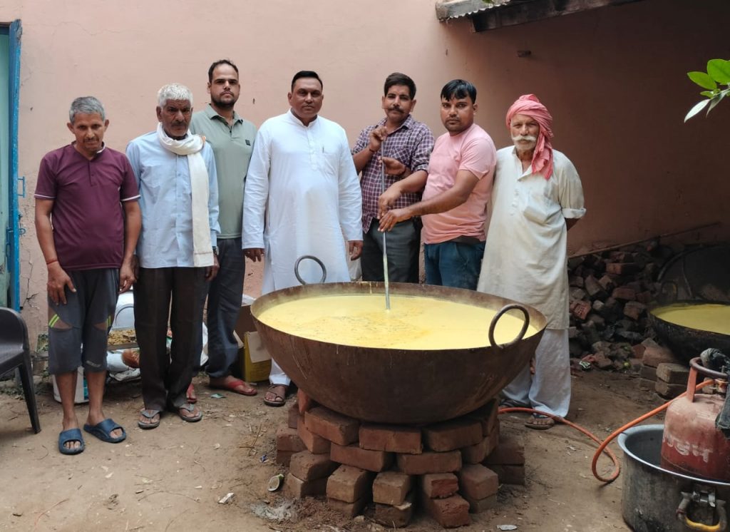 कनीना-सत्यनारायण मंदिर गुढा में अन्नकूट का प्रसाद तैयार करते मंदिर का पुजारी एवं अन्य।