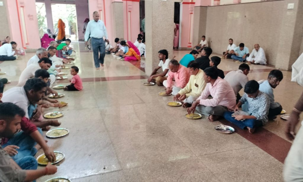 कनीना-मंदिर में पहुंचे श्रद्धालु अन्नकुट का प्रसाद ग्रहण करते श्रद्धालु तथा श्रद्धालुओं को प्रसाद वितरित करते मंदिर के टस्टी।