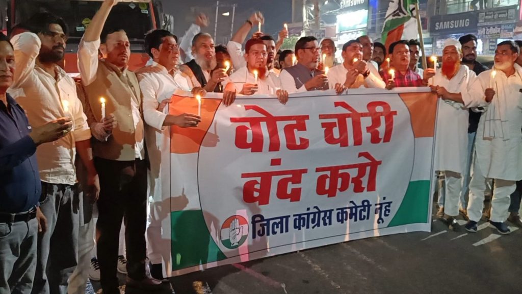 नूंह में कांग्रेस कार्यकर्ताओं ने वोट चोरी के विरोध में निकाला कैंडल मार्च, भाजपा पर लगाए गंभीर आरोप