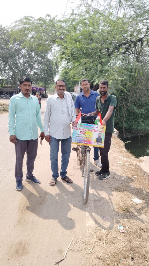 नूंह | गांव बिछोर और नीमका से गुजरने वाली ऐतिहासिक ब्रज चौरासी कोस परिक्रमा मार्ग से जहां इन दिनों श्रद्धालुओं का आवागमन जारी है,वहीं मथुरा के रहने वाले कृष्ण प्रजापति अपने अलग ही अंदाज में साइकिल लेकर ब्रज की यात्रा पर निकले हैं। उनकी साइकिल पर एक बैनर लगा हुआ है, जिसमें गौ माता राष्ट्रीय माता, नशा मुक्त भारत और समान शिक्षा लागू करने जैसी कई मुख्य मांगे लिखी हुई है। यात्रा के दौरान वह बीच–बीच में लोगों से मिल रहे हैं और उन्हें नशे के प्रति जागरूक भी कर रहे है। कृष्ण प्रजापति सोशल मीडिया इन्फ्लुएंसर भी हैं। जिनको फेसबुक पर 2 लाख से अधिक लोग फॉलो करते है। वह लगातार सोशल मीडिया पर भी लोगों को जागरूक करते रहते हैं।