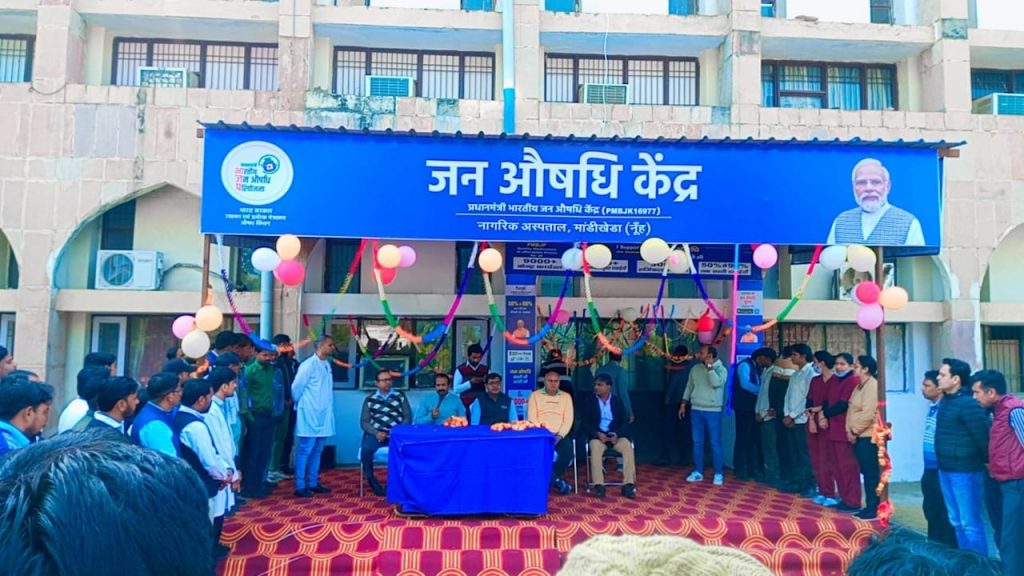 नूंह | नागरिक अस्पताल मांडीखेड़ा में प्रधानमंत्री भारतीय जन औषधी केंद्र का शुभारंभ जिला नूंह के सिविल सर्जन डा. सर्वजीत द्वारा किया गया। प्रधानमंत्री भारतीय जन औषधी परियोजना के बारे में जानकारी देते हुए जिला नूंह के सिविल सर्जन डॉ सर्वजीत ने बताया कि इस योजना में सरकार द्वारा उच्च गुणवत्ता वाली जैनरिक दवाईयों के एमआरपी ही बाजार मूल्य से 70 से 80 प्रतिशत तक कम किए गये है। सरकार द्वारा ‘जन औषधि केंद्र’ बनाए गए हैं, जहां जेनरिक दवाईयां उपलब्ध करवाई जा रही है।