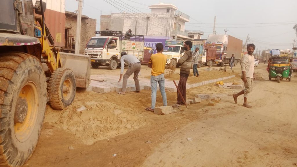 -पुन्हाना के ट्रक मार्केट के पास रोड पर लगाए जा रहे ब्लॉक।