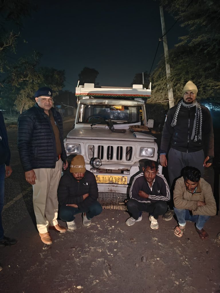 नूंह | नूंह जिले के फिरोजपुर झिरका थाना क्षेत्र में पुलिस ने एक गुप्त सूचना के आधार पर बड़ी कार्रवाई करते हुए तीन आरोपियों को अवैध हथियारों के साथ गिरफ्तार किया है। ये आरोपी अवारा गायों को गाड़ी में भरकर गो-तस्करी का काम करते थे और उनके पास से एक देशी पिस्तौल व तीन जिंदा कारतूस बरामद किए गए हैं। घटना 6 जनवरी की है, जब पुलिस की टीम दिल्ली-अलवर रोड पर धमाला के पास गश्त कर रही थी। गिरफ्तार आरोपियों में जमील, आजाद उर्फ काला और लुकमान शामिल हैं, जिनके खिलाफ भारतीय न्याय संहिता और आर्म्स एक्ट की धाराओं के तहत मुकदमा दर्ज किया गया है।