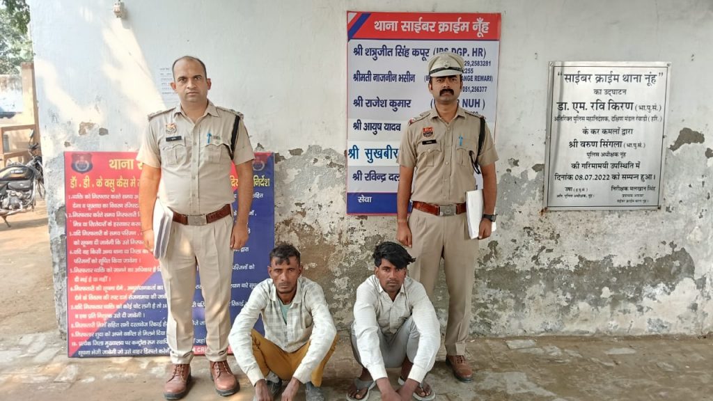 नूंह | जिला पुलिस की साइबर क्राइम शाखा ने कार्रवाई करते हुए जाली सिम कार्ड और फर्जी एटीएम कार्ड बेचने वाले दो आरोपियो इरफान उर्फ इफ्फा पुत्र आसिन और इकबाल पुत्र सौदान निवासी ग्राम खरवड़ थाना पहाड़ी, जिला डीग राजस्थान को गिरफ्तार किया है। दोनों आरोपियों को फिरोजपुर झिरका–तिजारा रोड स्थित ईदगाह के पास से दबोचा गया।